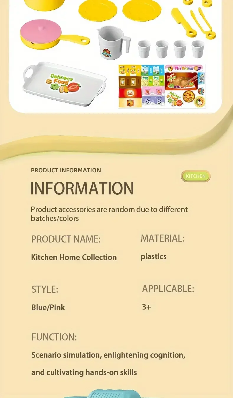 • Simulation :This toy set is a simulation of a real kitchen, allowing kids to learn about cooking and preparing food in a safe and fun way.